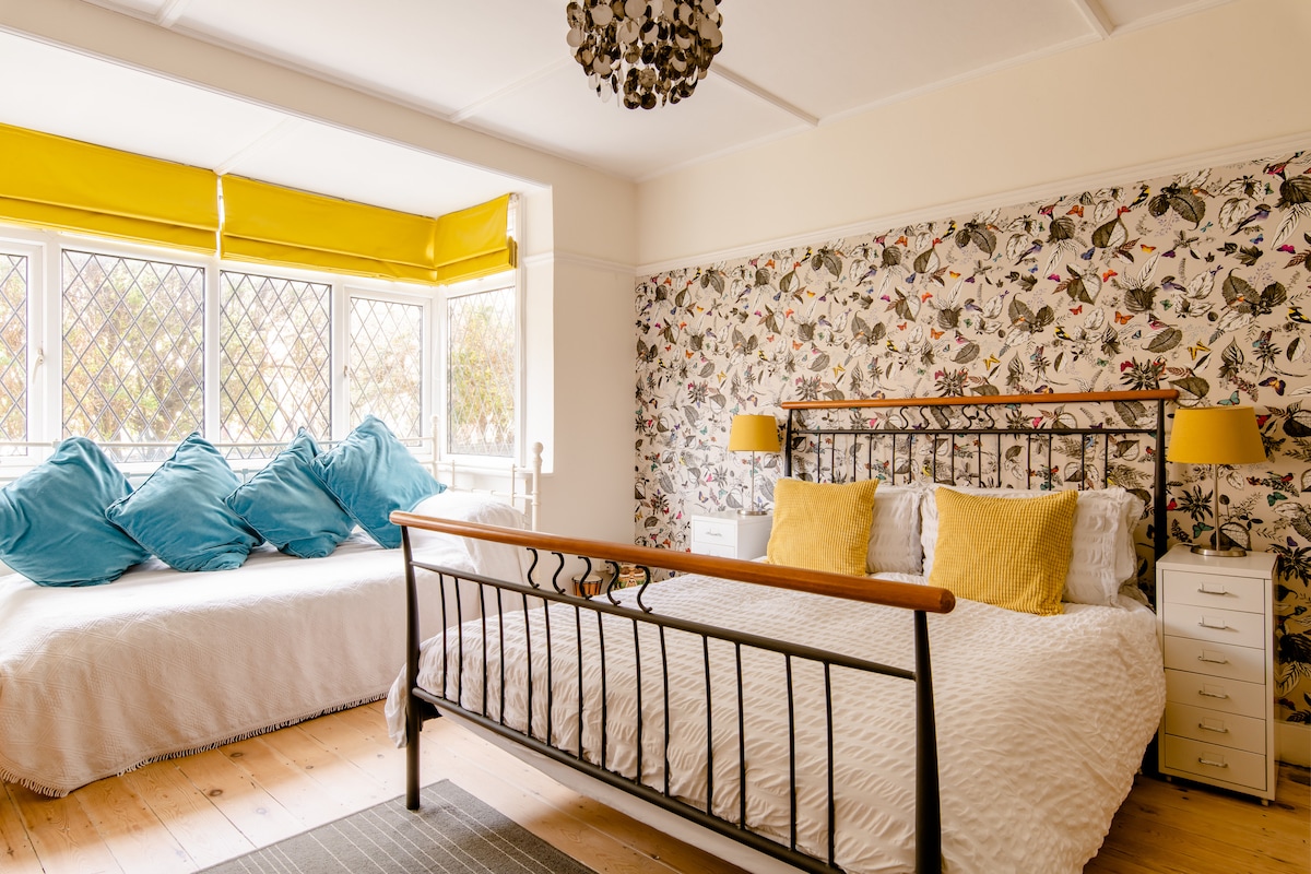 Двомісна спальня з прекрасним видом на сад і сільську місцевість, з місцем для зберігання, феном, телевізором і Wi-Fi. Ще одна кімната з двома односпальними ліжками доступна лише для членів однієї вечірки - дивіться окреме оголошення про дві спальні з двома односпальними ліжками - через спільну ванну кімнату. На жаль, мій будинок недоступний для інвалідних візків.