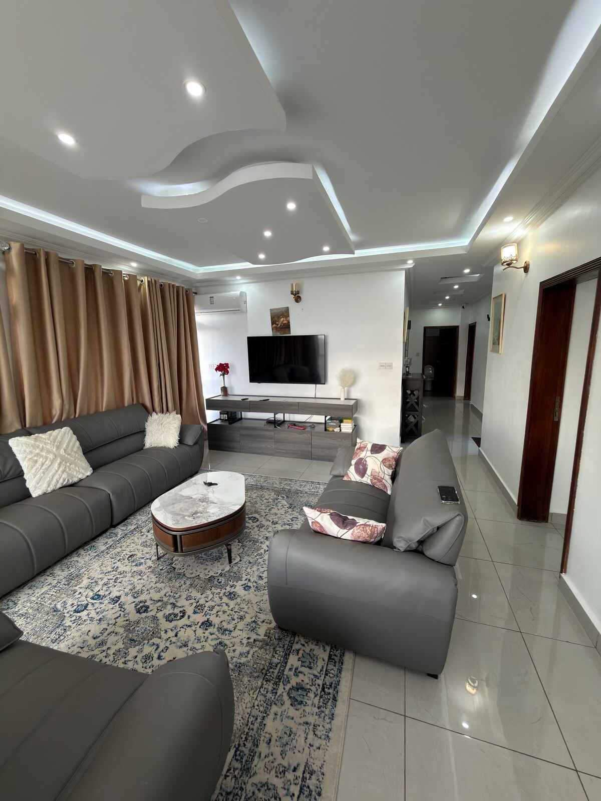 Forget your worries in this spacious and serene space. Tastefully decorated and fully furnished modern 3 bed house with scenic mountains views Perfect for: Remote workers, expats, travelers, and business visitors. Wi-Fi Guest Toilet AC Utensils Solar power Spacious parking Security guard CCTV Electricity Please note that Havillah Court is located the top of a steep hill but is accessible via a paved road from the main highway. You need a good car that can climb hills.