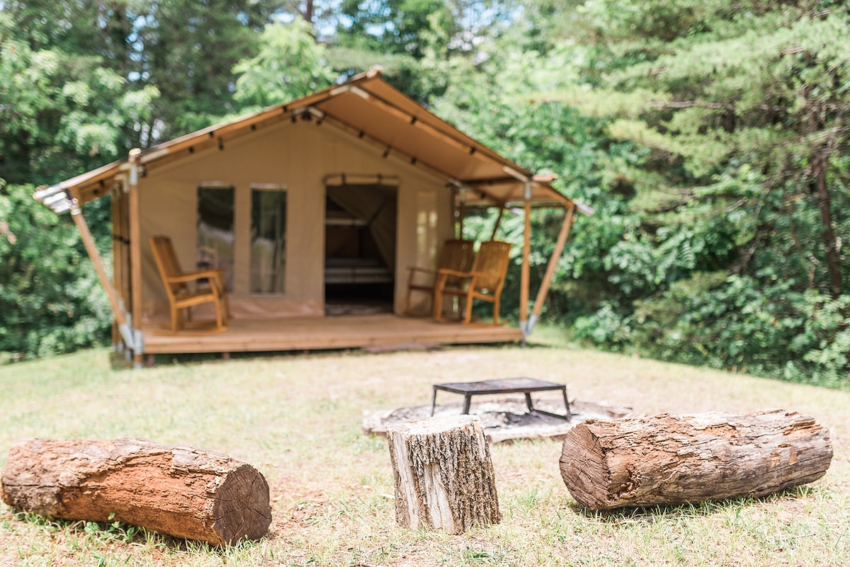 Розкішний табір у цьому наметі для глемпінгу! Ідеально підходить для тих авантюристів, які люблять відпочивати, але відпочивають без грубого відпочинку. Це полотняний намет із повноцінною ванною кімнатою, опаленням та повітрям, а також комфортними зручностями для проживання, такими як телевізор і гаряча вода. Ідеально підходить для відпочинку на вихідних або для наступних походів, їзди на велосипеді або кемпінгу. Зручно розташоване в зоні відпочинку мандрівників, між Грінвілл, Південна Кароліна та Ешвілл, Північна Кароліна. Поруч багато пішохідних і велосипедних хвостів. Це також недалеко від Університету Фурмана.
