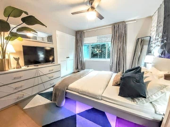 Шикарний міський заповідник із високими стелями, заспокійливими сірими тонами, темно-синіми шторами та вишуканими твори мистецтва з чорним каркасом. Ідеальне розташування: пішки до барів, ресторанів, конференц-центру та центру Капітолійського пагорба. Вхід без ключа для зручного прибуття/виїзду. Надзвичайно чиста ванна кімната, оновлена кухня, тиха вулиця. Ліжко queen-size з високоякісними простирадлами, диван-кровать, смарт-телевізор із функцією Chromecast, високошвидкісний WI-FI , повністю укомплектована кухня, стильний декор, абсолютно новий килим, рушники преміум-класу та засоби для ванни.