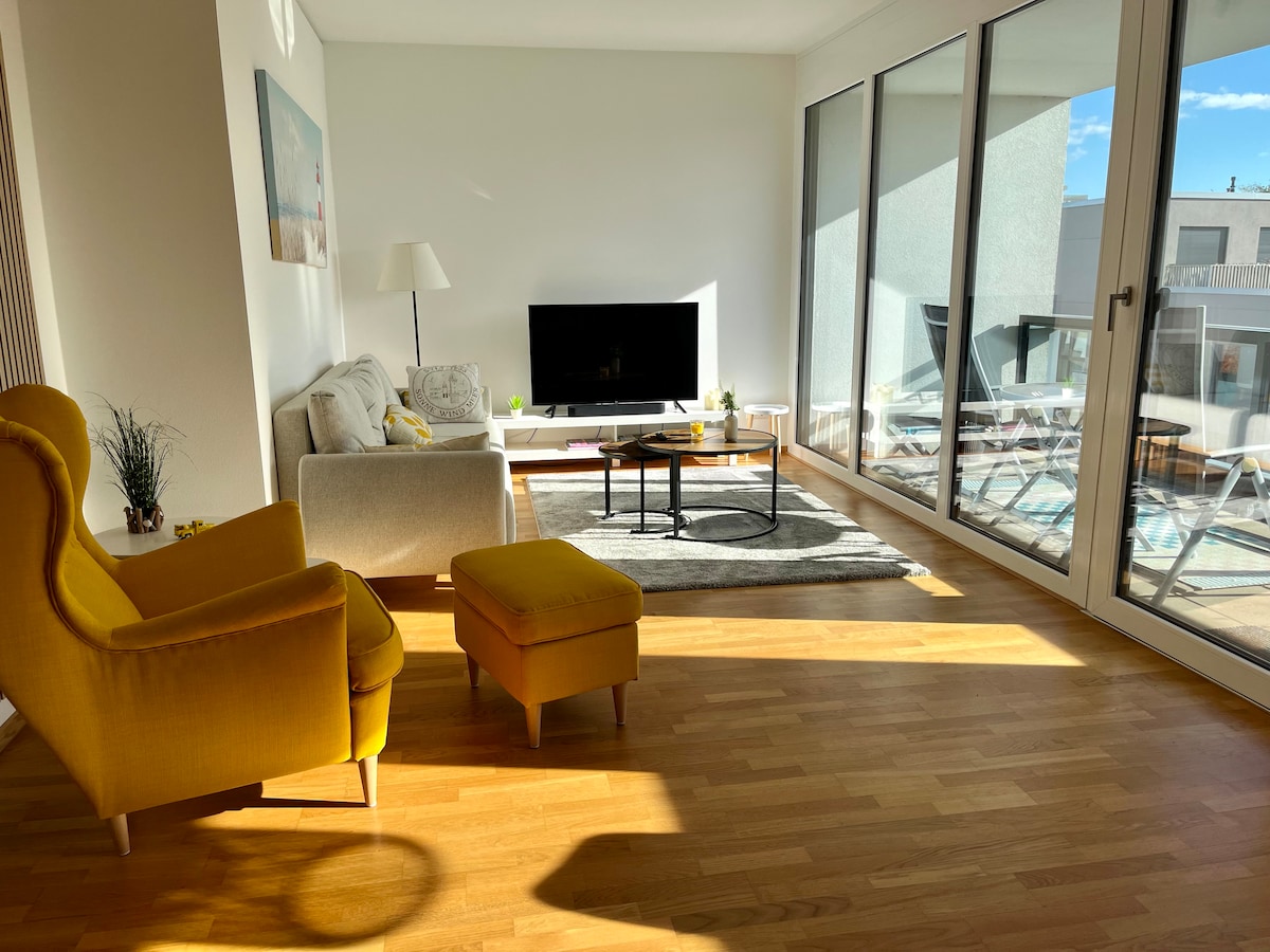 Простора квартира площею 64 квадратних метри з парковкою та настінною скринькою розташована на затишній житловій вулиці. До міста 5 хвилин ходьби. Ви можете швидко увійти в пішохідну зону Hermannsweg, Teutoburger Wald, Dörenther Klippen. Поруч розташовані альпіністський ліс, літній забіг, казковий ліс, пляжний клуб Aasee з бульйонним майданчиком і водний майданчик. До Оснабрюка або Мюнстера та Нідерландів можна дістатися автомобілем або поїздом менш ніж за годину. Настінна скринька для електромобілів !