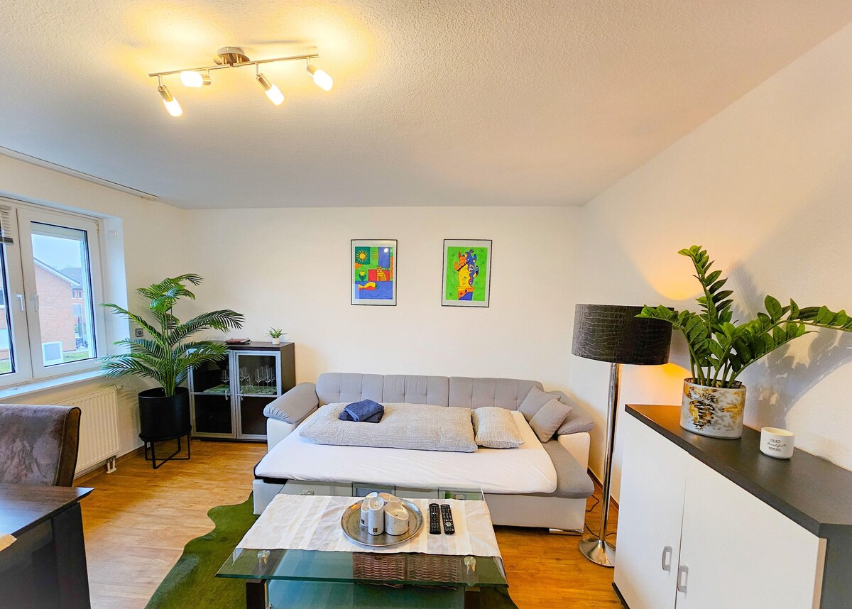 Стильно мебльована квартира в затишному місці. Ідеально підходить для піших походів у Тевтобургському лісі або для затишних вечорів на терасі з видом на невеликий сад, який повністю огороджений. Центр міста Іббенбюрен знаходиться за 3 км і в декількох хвилинах ходьби. До послуг гостей повністю автоматична кавоварка. У помешканні є одна спальня з двоспальною ліжком, а диван також можна використовувати як диван-ліжко для іншої людини. Прямо перед будинком є пряма парковка.