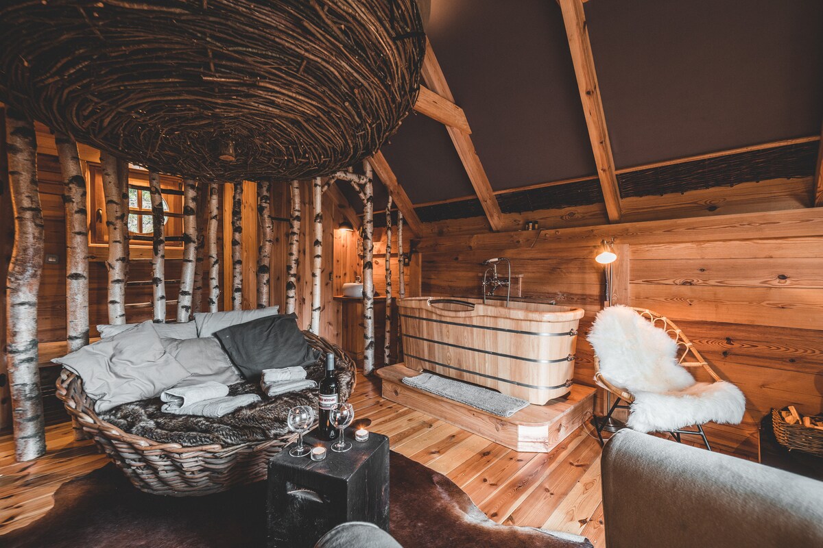 Perdue à flanc de colline, cette cabane romantique vous plonge au cœur de la forêt. Son grand lit lové dans un nid suspendu, accessible par une échelle en bouleaux, ravira les amoureux. Au rez-de-chaussée, un vaste canapé rond, une baignoire en bois face au feu et une ambiance féerique vous invitent à rêver, loin du quotidien.