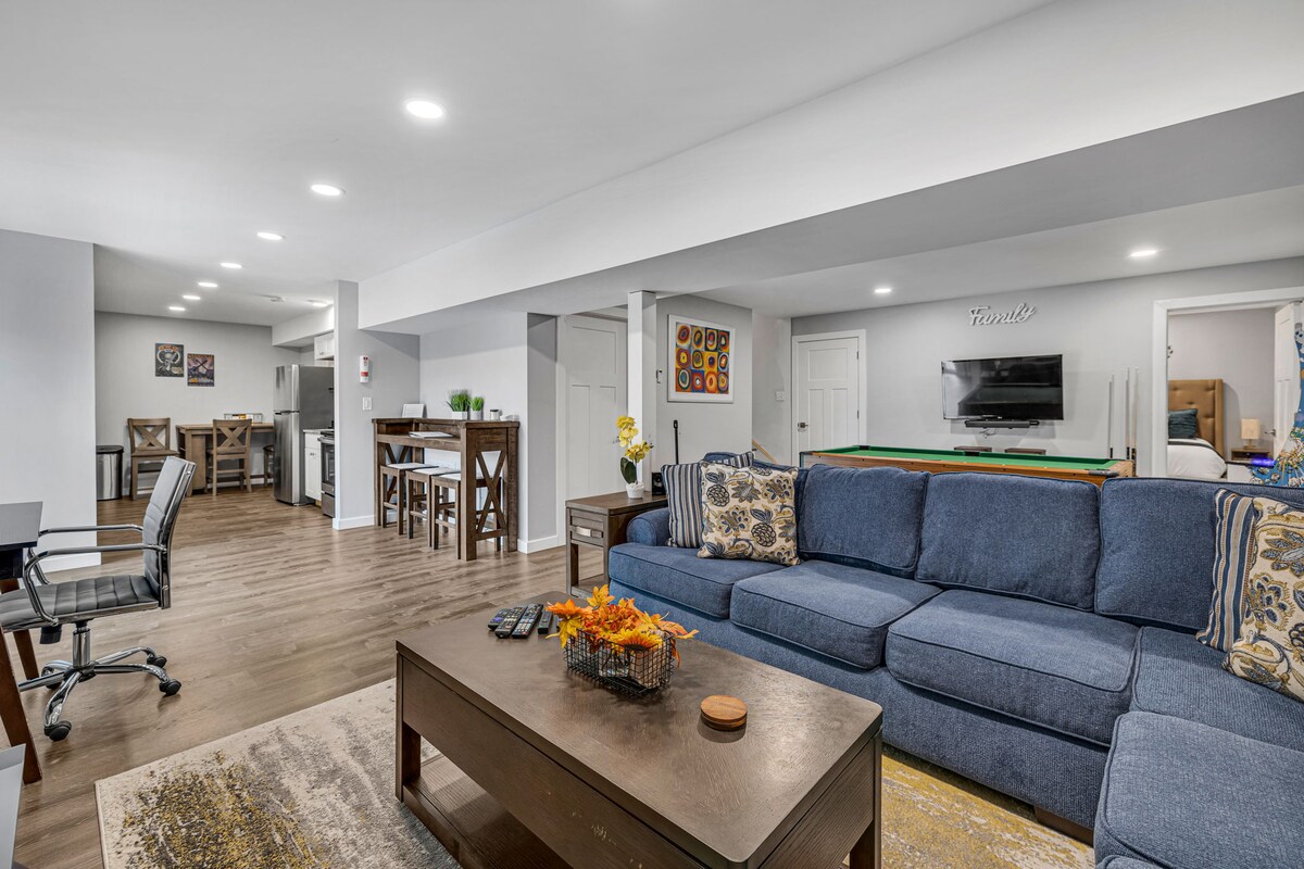 Насолоджуйтеся спокійним приватним відпочинком у тихому районі на тупиковій вулиці з власною гідромасажною ванною та басейном, всього в 20 хвилинах від центру Нешвілла! У цьому повністю мебльованому приватному підвальному приміщенні є спальня з квін-сайзом, розкішна окрема ванна кімната та окрема вітальня з телевізором і проектором. На повній міні-кухні є холодильник, мікрохвильова піч, кавоварка та чайник. Розслабтеся на вулиці з гідромасажною ванною, каміном, телевізором на відкритому повітрі, басейном, баскетбольним обручем і місцем для багаття.