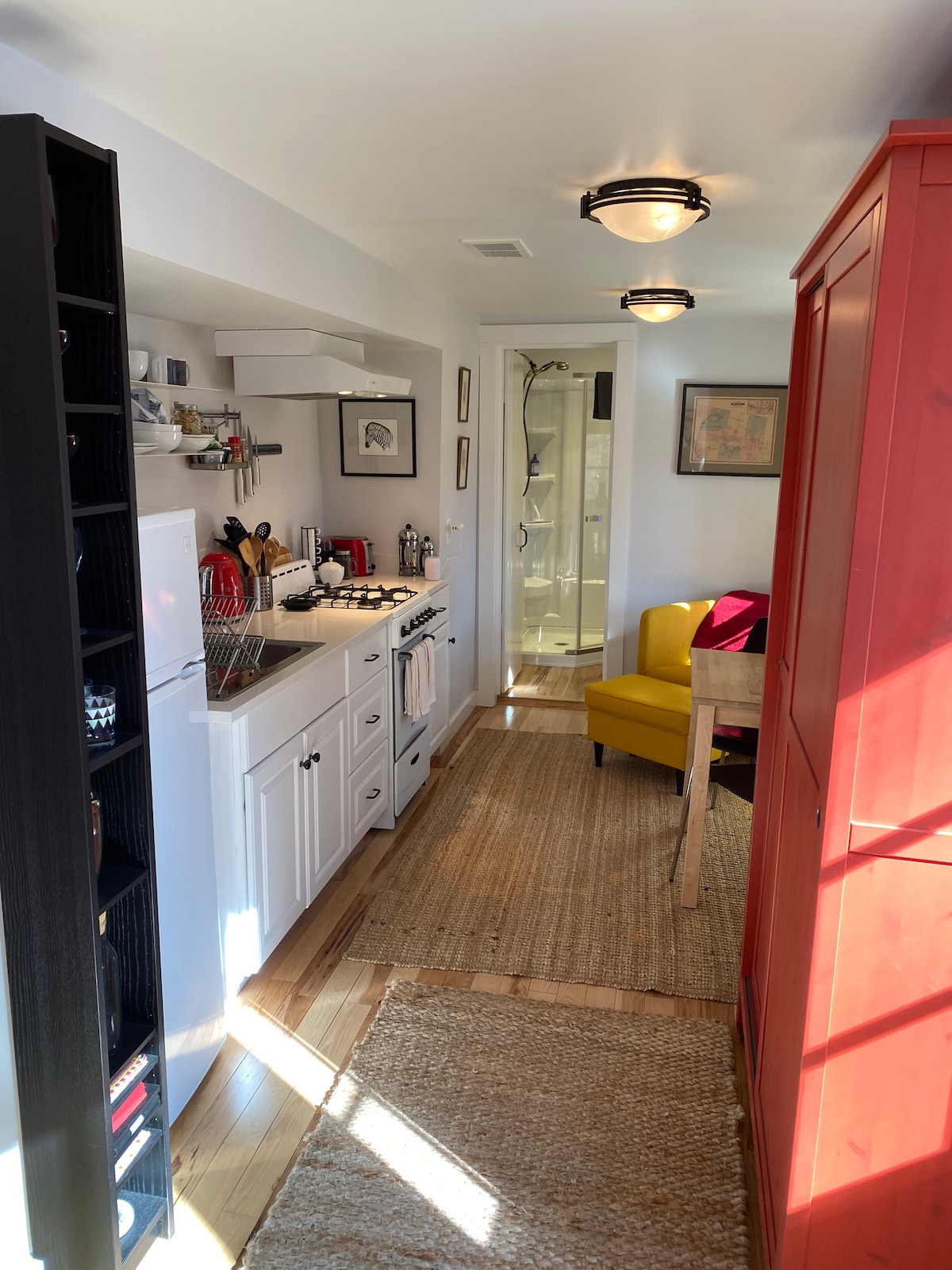 Унікальна приватна та тиха квартира з 2 спальнями (1 двоспальне ліжко, два односпальні ліжка, 1 диван-ліжко), повністю автономна, на 2 поверхах, з власним окремим входом. На першому поверсі є передпокій та повноцінна кухня-їдальня. На другому поверсі є вітальня, ванна кімната та 2 спальні. Наше помешкання розташоване в крайньому крилі класичного будинку 1795 року побудови Shaker Hollow і прилягає до нього. Кам'яне патіо з вуличними меблями виходить на сад і луг площею 3,5 акра. У вашому розпорядженні велике місце для багаття та газовий гриль.