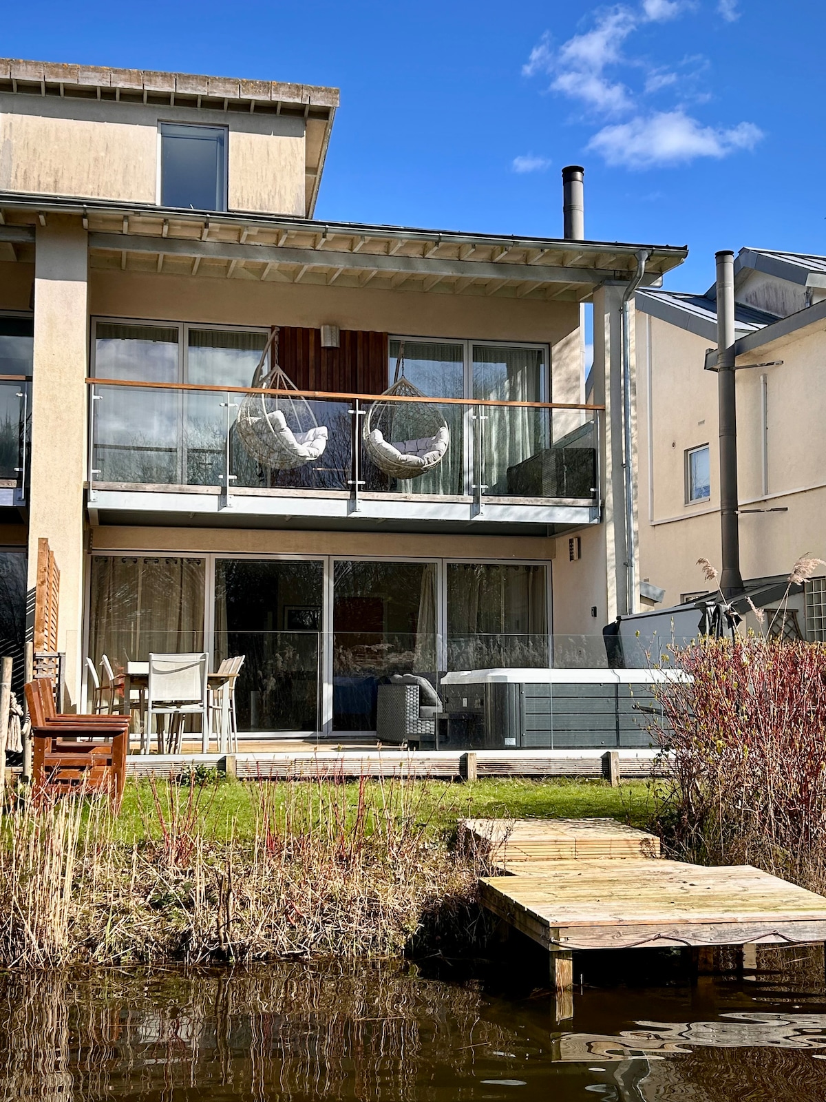 Котедж Hoopoe — це сучасний будинок із 4 спальнями на березі озера з окремою гідромасажною ванною та повністю закритою терасою в ексклюзивному районі Lower Mill Estate, прекрасному заповіднику площею 550 акрів з озерами, відзначеним нагородами спа-центром, критими/відкритими басейнами та безліччю розваг. Наше просторе помешкання розташоване на 3 поверхах, з повністю закритою терасою на першому поверсі та двома спальнями з балконом, що виходить на озеро Клірвотер. Чудове місце, де можна розслабитися з друзями та родиною.