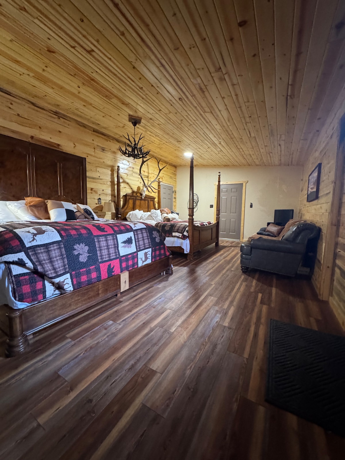 We are excited to share our custom cabin. The space is versatile and works well for a couple’s get away, couple’s trip, families or possibly 2 small families. We use the cabin with friends and family periodically so we have one closet and one room above the garage that are locked for personal items. 6 guests comfortably 2 bedrooms 4 beds-1 Queen, 1 Double, 1 twin, 1 futon & a pull out mattress 2 baths – 1 walk in shower, 1 full bathtub. Self Check-in .... Check yourself in with the lockbox