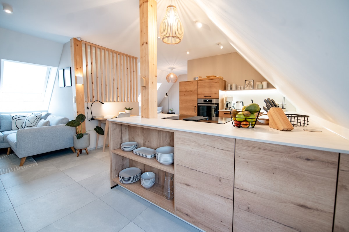 Dieses große Studio besticht durch den Sichtdachstuhl, der eine sehr behagliche Atmosphäre erzeugt. In dem Holzhaus ist eine permanente Lüftung vorhanden. Im Schlafzimmer sorgt ein großes Wasserbett (2 m x 2,20 m) für guten Schlaf. Die Unterkunft wurde liebevoll individuell ausgestattet. Die Küche ist klein aber super ausgestattet. Grillen und Sonnen im Garten. Ladestation für eAutos (0,40 €/kWh) vorhanden, 2 Cube eBikes und Thule Cab2 können ausgeliehen werden, Aussensauna neu!