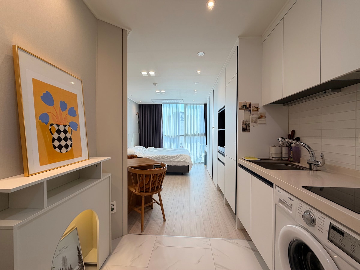 Sunstay 💘 ● Stunning ocean & sunset view ● A new building built in 2024 ● Big cafe table ● Beam projector ● 50-inch Google Smart TV ● SK Broadband Btv ● Free Netflix, Youtube Premium ● Electric kettle, toaster ● Various drinking glasses (sake/beer/soju/wine/champagne) and kitchen utensils ● Washing machine, heat drying rack ● Make-up table, straight/curling iron ● English chat, call ok ● Immigration support (confirmation letter of accommodation, rental contract) available ☆ 💧 pressure settled