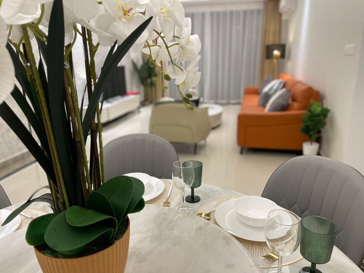 Вітаємо нашу затишну простору з 3 ліжками і ванними кімнатами на 6 осіб!! ❤️ Наше розташування знаходиться в центрі міста Джохор-Бару, всього в 10 хвилинах ходьби від критого мосту CIQ, JB sentral , Міської площі та Комтара. 🚶🏻Він дуже підходить для сімейного відпочинку , групи друзів, бізнес-мандрівників або туристів 🌹 Наша квартира з видом на спокійний сад з великого балкона. Торговий центр R&F знаходиться на вашому протилежному боці: Jaya Grocer, пральня, 7-11, ресторани та магазини знаходяться на першому поверсі. 🌻Приходьте насолоджуватися ^^