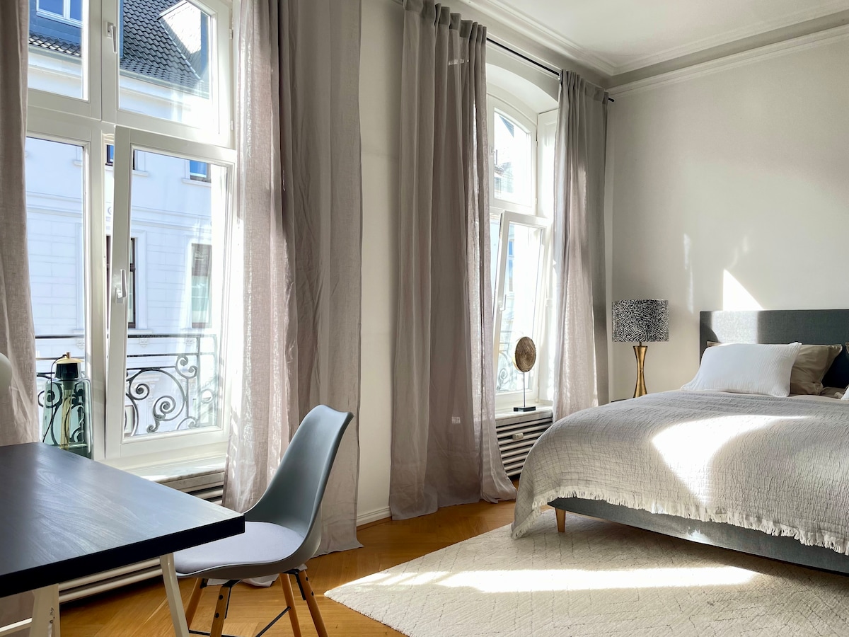 Сучасне і стильне проживання відповідає історичній чарівності. Ласкаво просимо до нашої нової повністю оновленої та чудової мебльованої студії. Лише 15 хвилин робочої відстані від головного залізничного вокзалу Вупперталя. *Мало особливостей:* > Безкоштовний Wi-Fi > Безкоштовне паркування за квартал > Smart TV з Netflix, музикою тощо > Постільна білизна та рушники включно. > Повністю мебльована кухня > Великий холодильник з морозильною камерою > Кавомашина Nespresso > Додаткові вкладки кави та вибір чаю > Ліжко King Size (200 см x 200 см) > Гардероб