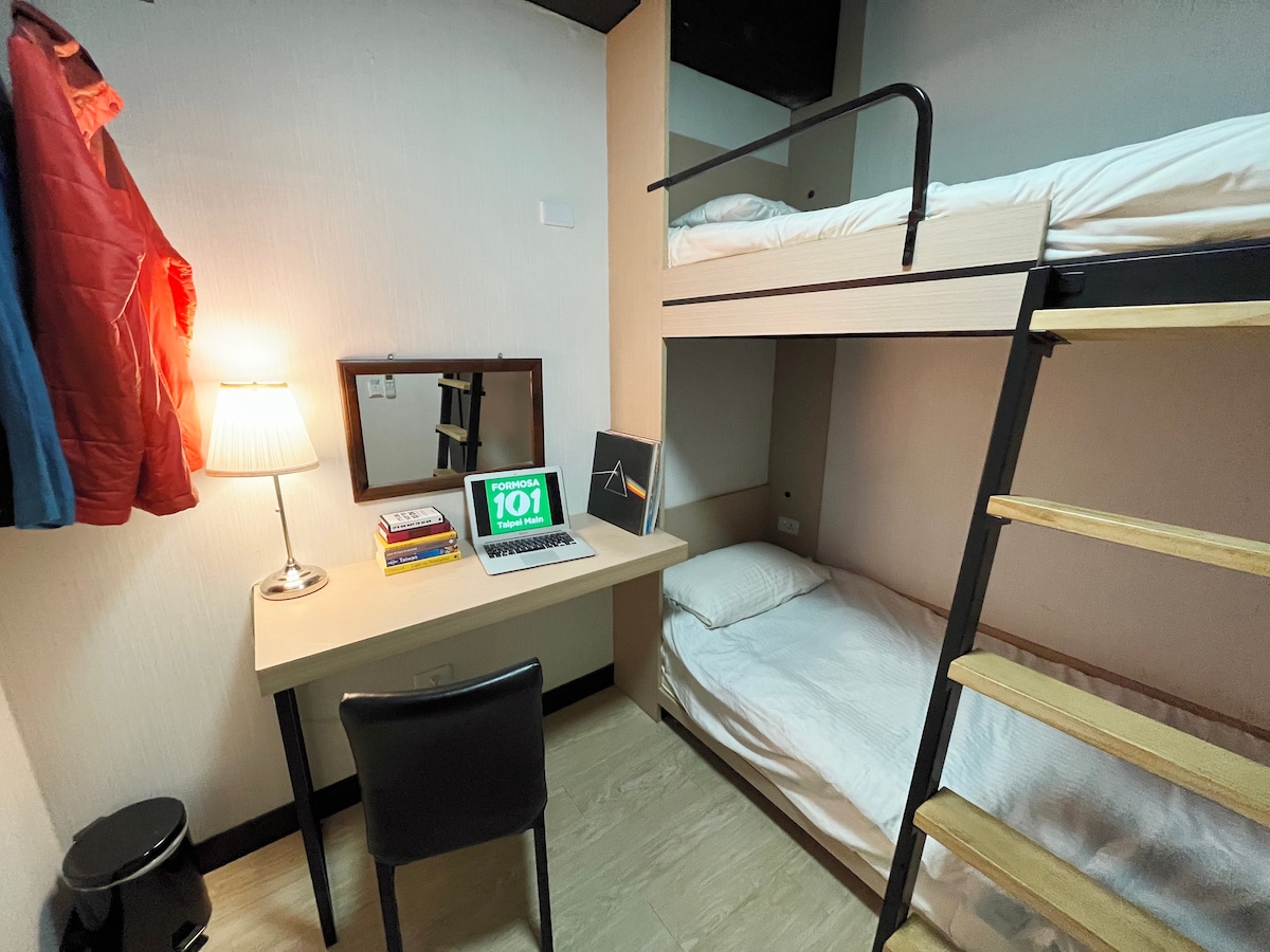 Чудова кімната з 2 односпальними ліжками (двоспальними): WI-FI, кондиціонером, телевізором. Доступ до всіх громадських зручностей: вітальні, кухні, пральних та сушильних машин. Стійка реєстрації на території працює щодня з 9:00 до 21:00. Самостійне прибуття можливе щодня після 21:00. Розташований всього в декількох хвилинах ходьби від головного вокзалу Тайбея (MRT, HSR, TRA), наші гості можуть насолоджуватися великою різноманітною пам 'ятками та пам' ятками Тайбею, перебуваючи всього в декількох хвилинах ходьби від району Сімінг. Головний вокзал Тайбея, станція метро Ximen, аеропорт Таоюань, Ximending - усе менше 10 хвилин