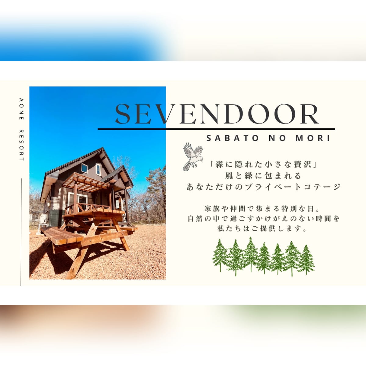 Це приватний котедж для приватної оренди, розташований у затишному районі з віллами. За помешканням тече струмок, і його тихий шепіт створює приємну атмосферу для сімейного відпочинку. Оскільки це окреме помешкання, де ви можете зупинитися, не турбуючись про оточення, ви можете почуватися комфортно навіть із маленькими дітьми. Звуки веселих ігор і сміху також стануть частиною ваших спогадів. Ви також можете насолоджуватися барбекю на задньому дворі. Провести час біля вогнища на природі, насолоджуючись спільною трапезою, – це справді особливий досвід. Вони перетворюють звичайну трапезу на дещо особливе враження. Прокиньтеся вранці під спів птахів, проведіть день, вільно граючись надворі, Потім, під світловим люком, що веде до лофту, насолодіться розслаблюючою чайною перервою. Помешкання, яке дозволяє відпочити від повсякденного життя та насолодитися безтурботним перебуванням, – ось що робить його особливим. Чому б не створити незабутні спогади з родиною та друзями тут, у SEVENDOOR?
