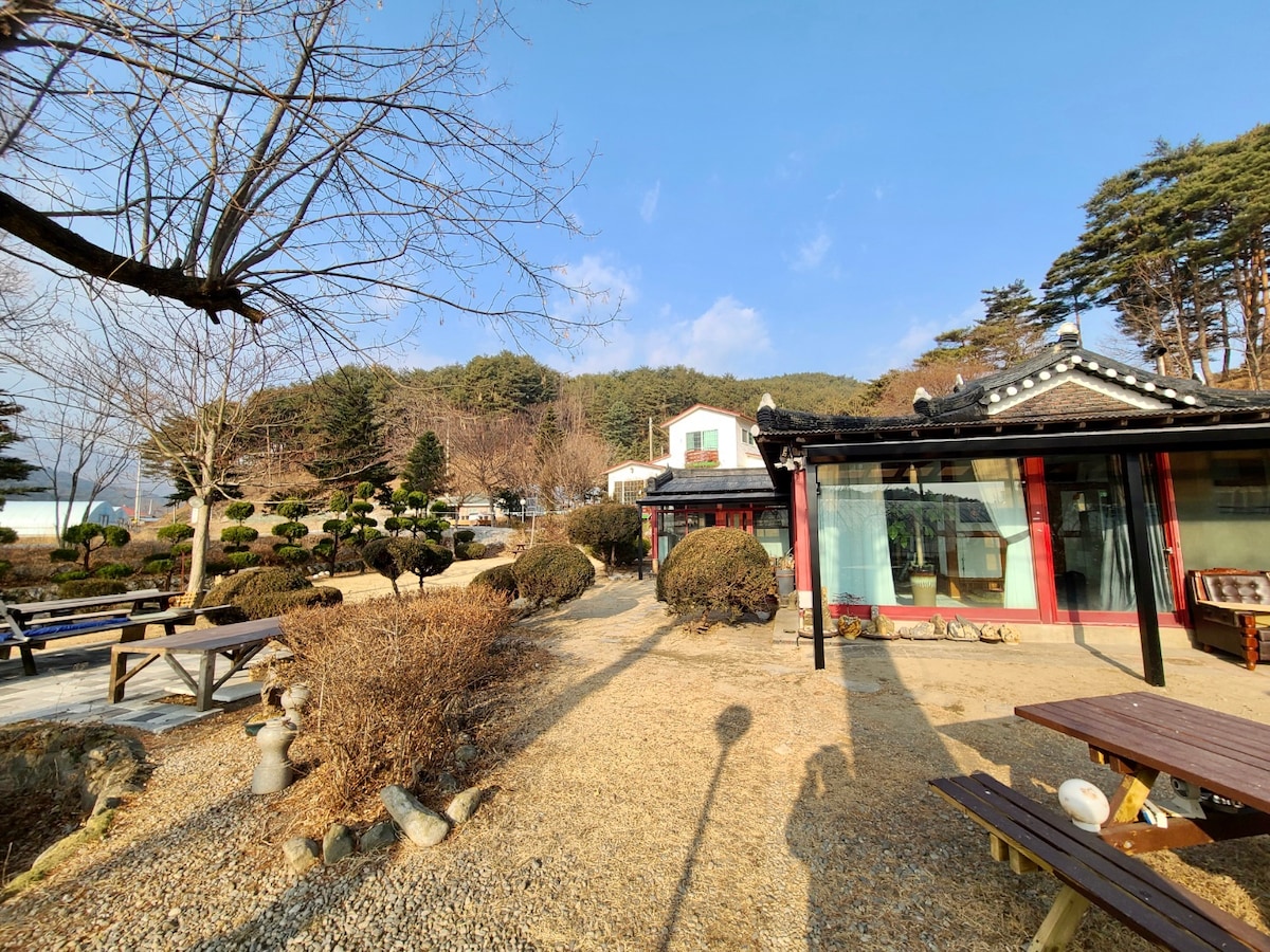 Гірський собака, небесна яма, зірковий собака, місце для багаття... Місце, де ви нічого не можете зробити і бути порожнім. Ми обслуговуємо лише одну групу людей, які хочуть насолодитися чистим повітрям і панорамними пейзажами в місці без забруднення та шуму. Влітку ви можете відчути органічні овочі та екологічно чисту кімнату з далекими інфрачервоними променями взимку, а також приватне патіо на задньому дворі зі студією з ванною кімнатою. - Вартість барбекю становить 20 000 вон, і ми надаємо сіль, перець та інструменти для барбекю. Використання місця для багаття безкоштовне, і, будь ласка, приберіть його після використання (придбайте дрова). - Це місце розташоване на висоті 700 м над рівнем моря, тому обов 'язково візьміть із собою тепле пальто, оскільки температура нижча, ніж у рівній. - Оскільки це природний простір, ви можете побачити комах всередині та зовні. Ознайомтеся з ним під час бронювання. - Двоколісні автомобілі можуть бути не в змозі під 'їхати під час сильного снігопаду. У такому разі ми допоможемо вам пересуватися на автомобілі.