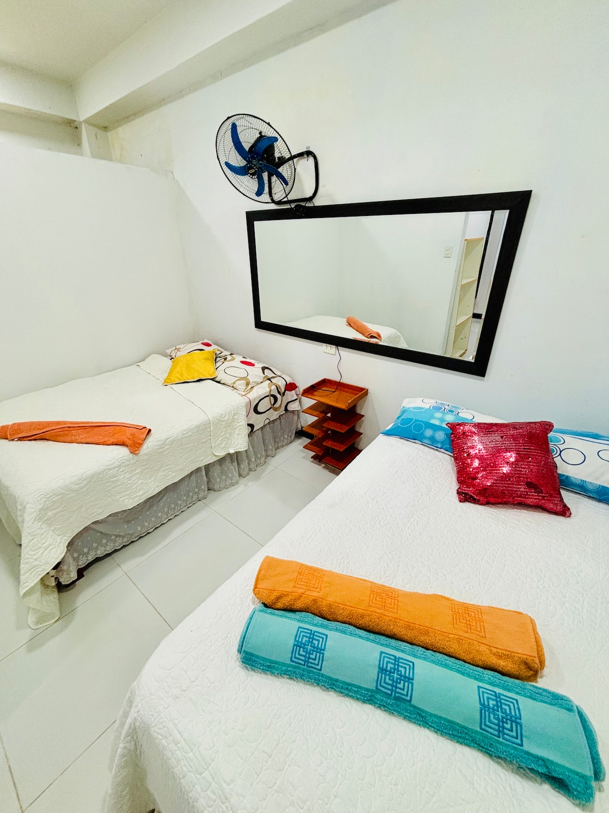 1. Приватне помешкання з прямим доступом, на другому поверсі, кондиціонер, швидкісний Wi-Fi та вид на вулицю. Розташована в 12 кварталах від площі Пласа-де-Армас. 2 спальні: двоспальна з ліжком Quee, плюс 1,5 матраца на підлозі та ще одна двоспальна з 2 ліжками на 1,5 ліжка. 1 повна ванна кімната, 3 стельові вентилятори, кухня, вітальня, їдальня з 2 смарт-телевізорами, приватна пральня. Напольний матрац для п’ятого гостя. 2. СПІЛЬНА ТЕРАСА з пральною машиною, вугільним грилем, їдальнею, ванною кімнатою.