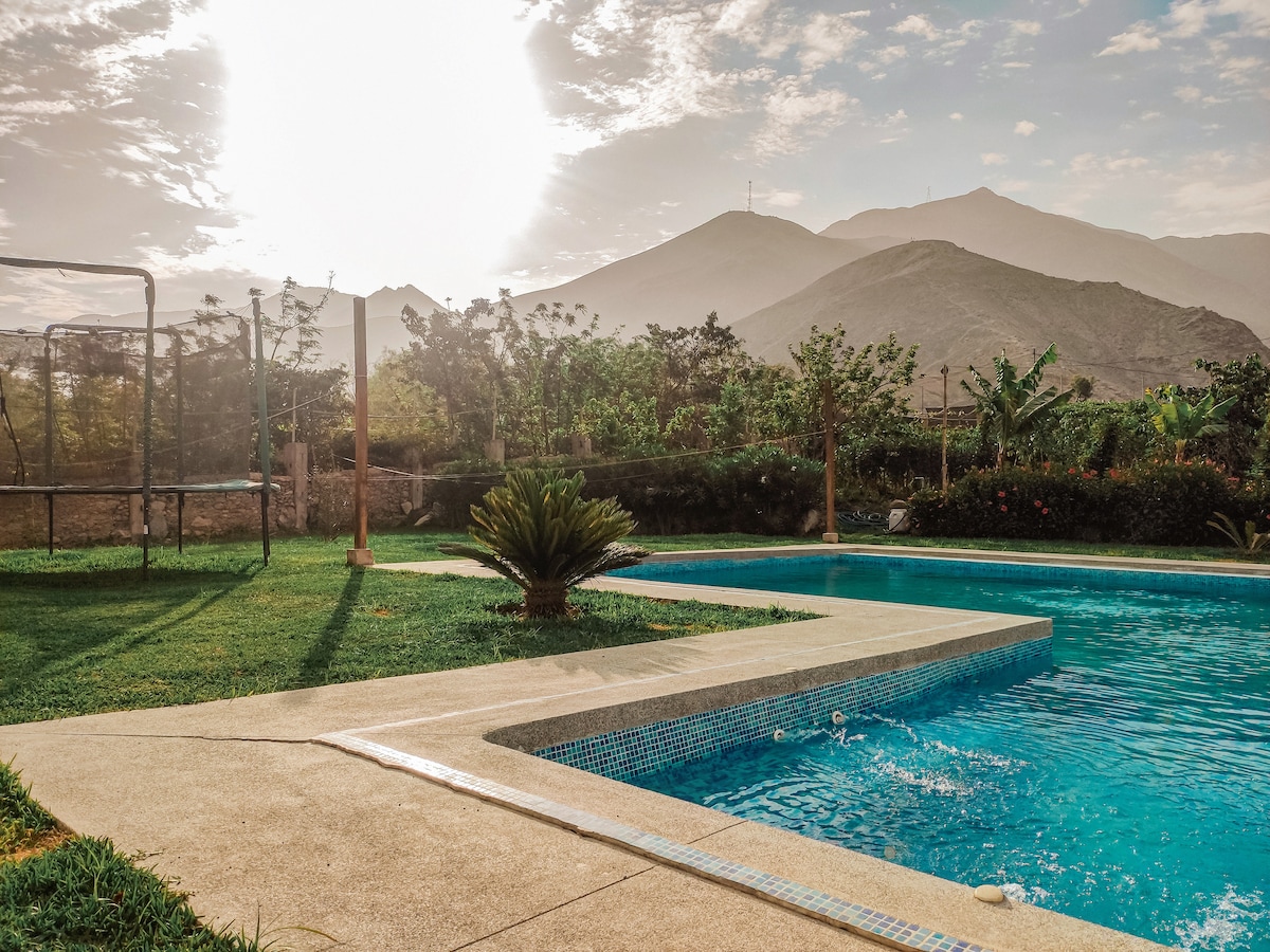 Ласкаво просимо до La Casa Bella de Lunahuaná🌞🍃. Насолодіться унікальним і привітним досвідом, де сонце завжди з вами. Розташована в тихому та безпечному районі, оточена природою, вона ідеально підходить для відключення від стресу та відновлення зв’язку з найважливішим: спокоєм, свіжим повітрям та незабутніми моментами. Наш будинок поєднує в собі сільський шарм із сучасними штрихами завдяки великим скляним екранам, які наповнюють приміщення природним світлом. Ідеально підходить для сімей, пар або груп друзів.