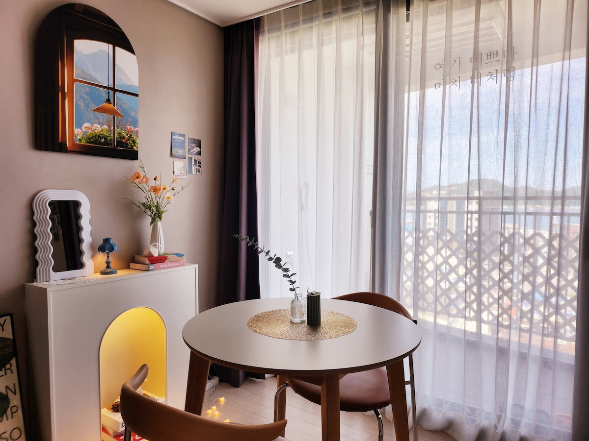 Помешкання - це тихе та спокійне помешкання, де можна полегшити втому під час подорожі. З тераси відкривається блискучий вид на океан Ви можете відчути спокій:) Ви можете відвідайте основні туристичні об 'єкти Йосу за 7 хвилин і 15 хвилин на автомобілі, 5 хвилин пішки - Торговий центр Lotte - 2 хвилини на автомобілі - Yeosu Food Mart розташований. На першому поверсі є магазини, де можна насолодитися кавою Ідії, магазинами та курячим пивом:)