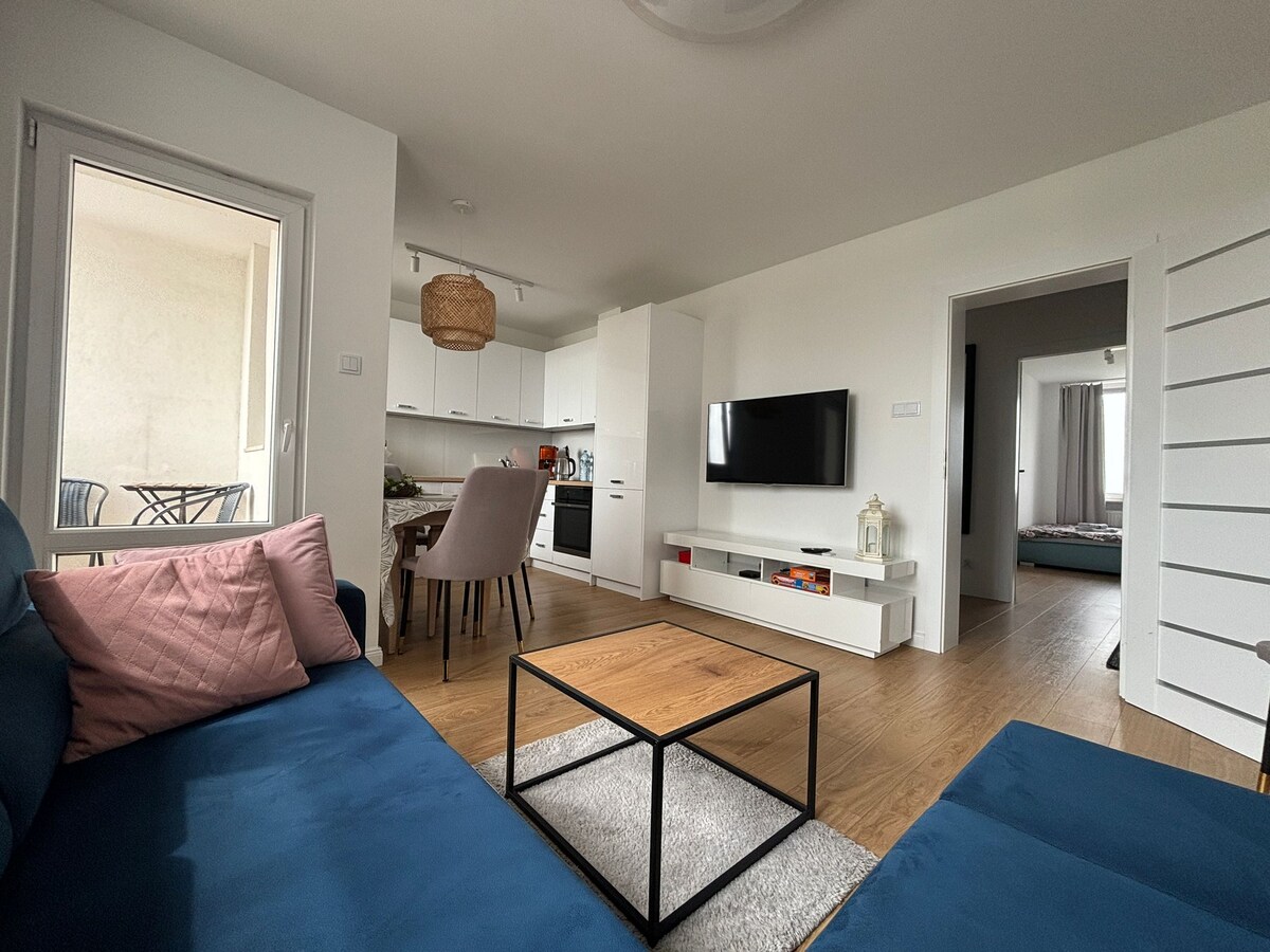 Комфортабельні, повністю обладнані апартаменти в новій будівлі. Вітальня з відкритою кухнею, розділена на їдальню та зону відпочинку. У спальні є велике ліжко та просторий шафа. Також є гардеробна як додаткове місце для зберігання. Поруч є магазини, ресторани та кафе Обладнання: кондиціонер, кавоварка, чайник, праска, прасувальна дошка, пральна машина Як дістатися з аеропорту Шопена 20 хвилин на таксі 50 хвилин на громадському транспорті з аеропорту Модлін 50 хвилин на таксі 120 хвилин на громадському транспорті