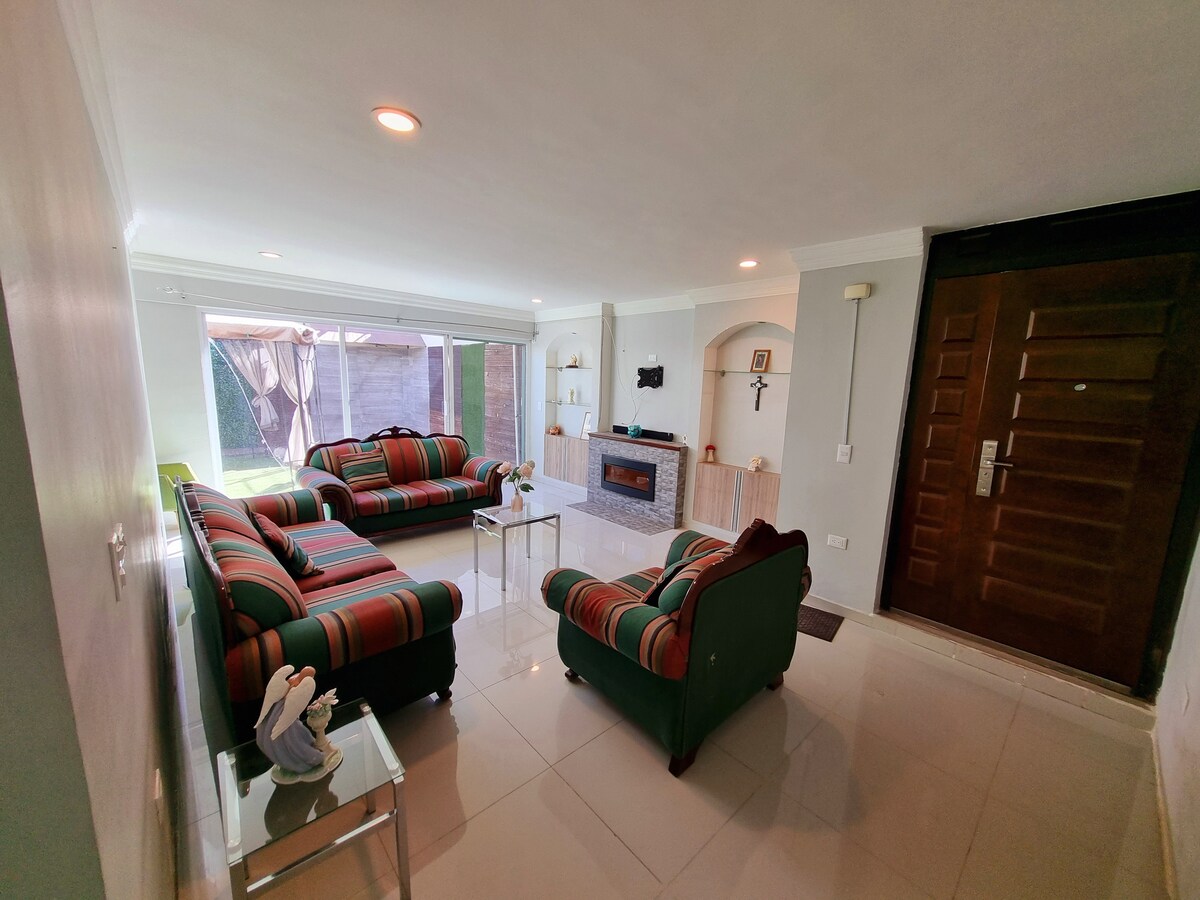 Хороший сільський будинок з кліматизованим басейном і зеленими пейзажами, невеликим пагорбом, на який можна піднятися, і з вершини милуйтеся видом на «Ель-Серро-дель-Муерто» на заході, а на схід відкривається панорамний вид на місто Агуаскальєнтес. 3 спальні, телевізійна кімната, 2 ванні кімнати, вітальня та їдальня, кухня та кіоско, де ви можете відпочити, поки ваші діти або друзі грати в басейні.