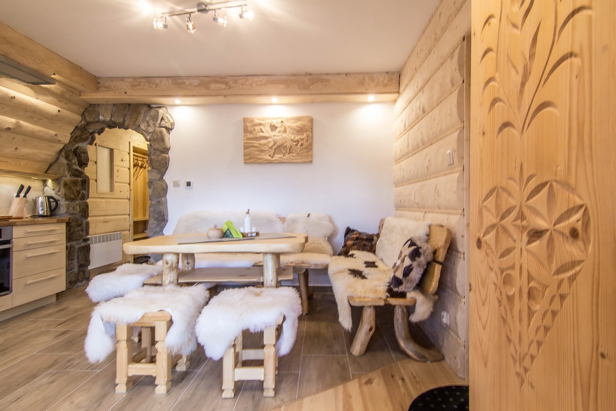Квартира оформлена в стилі Закопане, що поєднує в собі високогір 'я з сучасністю. Численні елементи скелелазіння дарують настрій високих гірських турів. У дерев 'яному інтер' єрі ТА БІЛЯ КАМІНА можна відчути атмосферу навколишніх ГІР. У квартирі є ВЕЛИКА ТЕРАСА з прекрасним ВИДОМ НА ГОРИ ТАТРИ.
