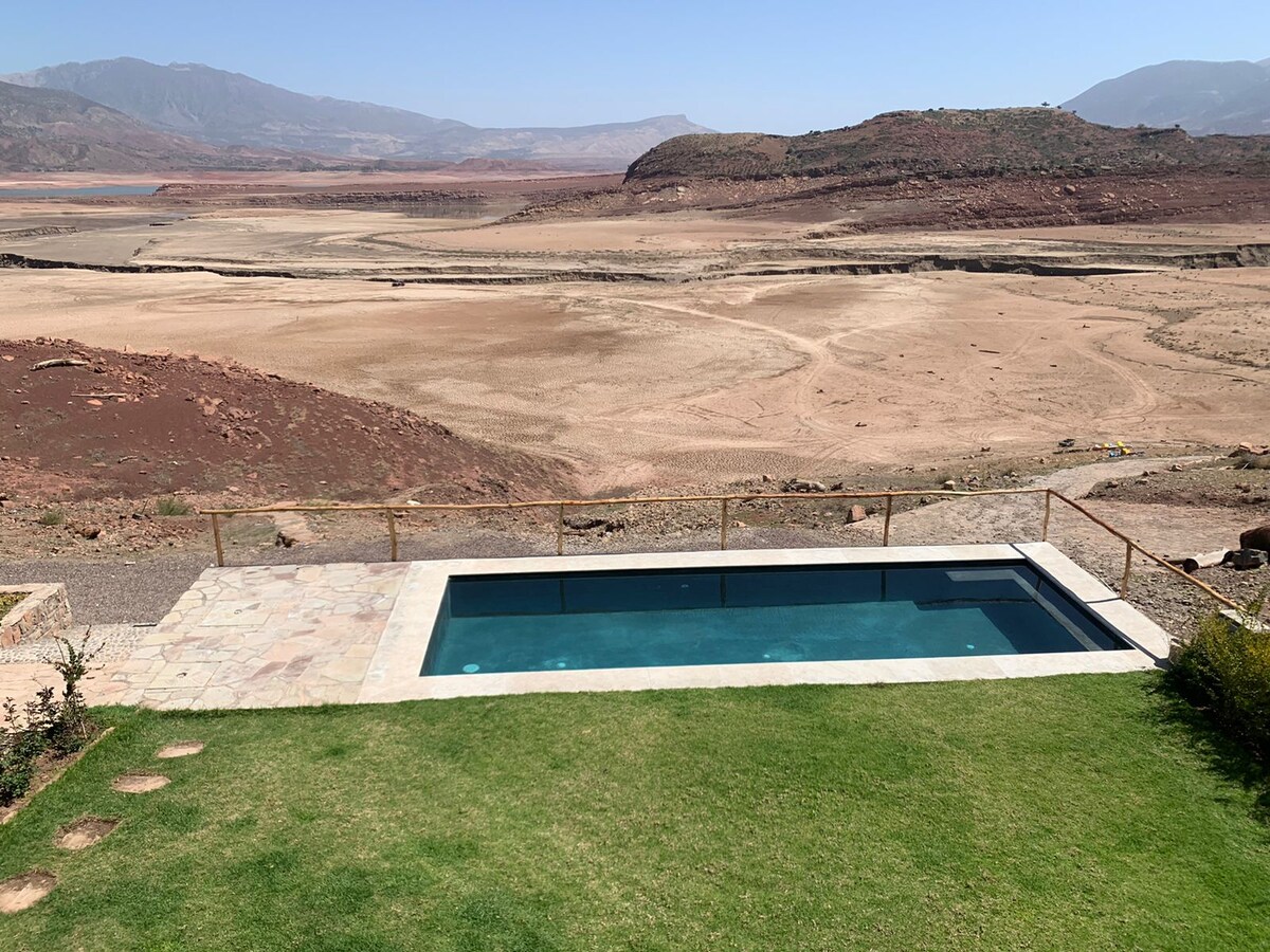 Чарівний будинок нещодавно побудований і оздоблений в берберському стилі без протилежного панорамного виду на гори Атласу та величне озеро Бін Ель Уідан, а також песцина. Складається з 5 спалень,туалету з душем та 1 великої вітальні, повністю обладнаної кухні, кондиціонера,каміну та телевізора, великого саду з 6 терасами зі столами для їжі в сільській місцевості, що дозволяє насолоджуватися панорамою під час перебування в тіні, гамака для відпочинку, качелі
