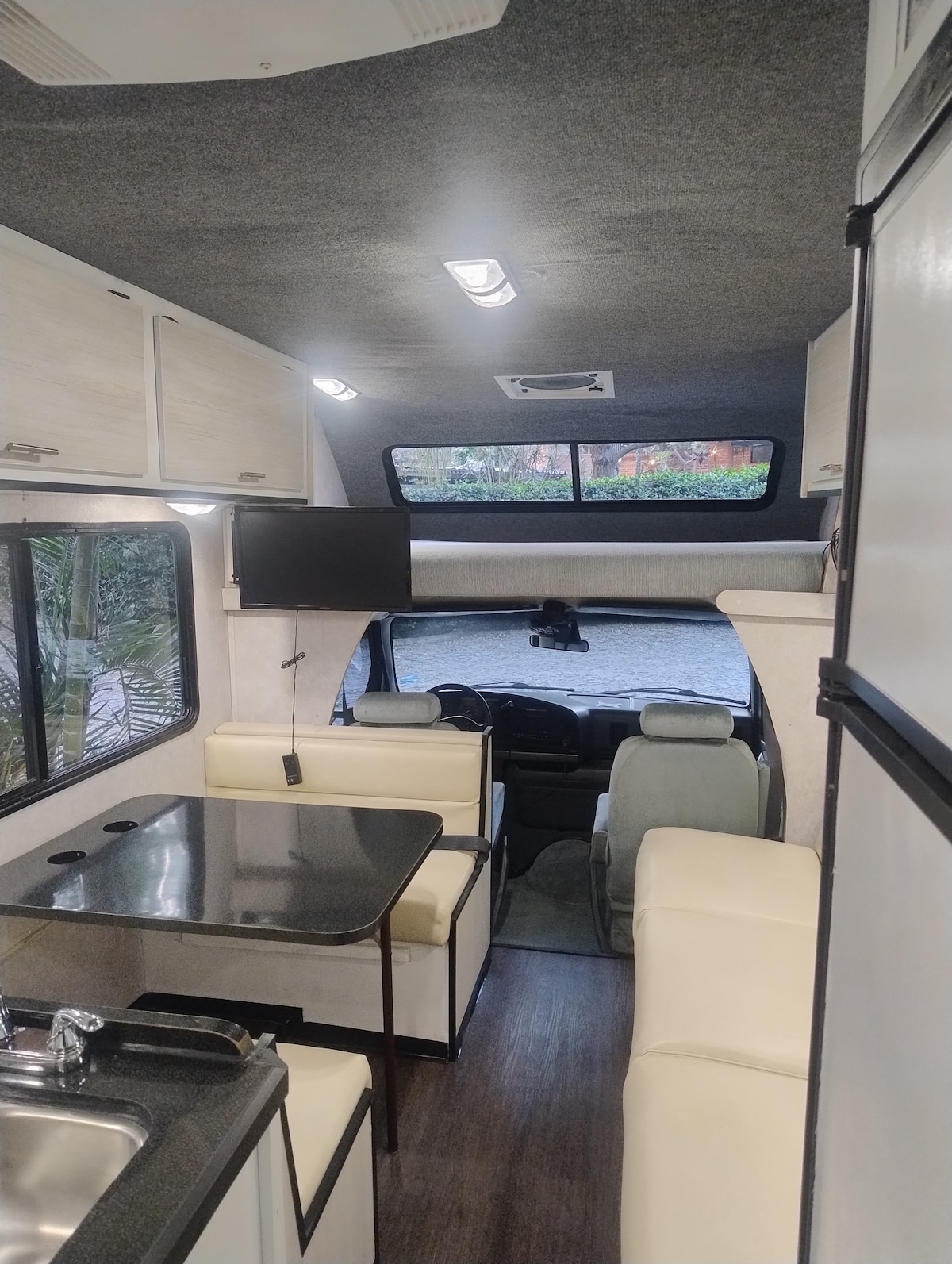 Descubre el hermoso paisaje que rodea este lugar para hospedarse sin salir de la ciudad es nuestro motorhome está equipado con todos los servicios un ambiente súper agradable está ubicado en San José del tajo rodeado de árboles mesa para comer al aire libre hacer fogata un lugar súper ubicado y seguro a 100 metros saliendo de la propiedad se encuentra el Costco Sam's Walmart infinidad de plazas alrededor y a sólo un kilómetro del estadio akron apto para cuatro personas cómodamente