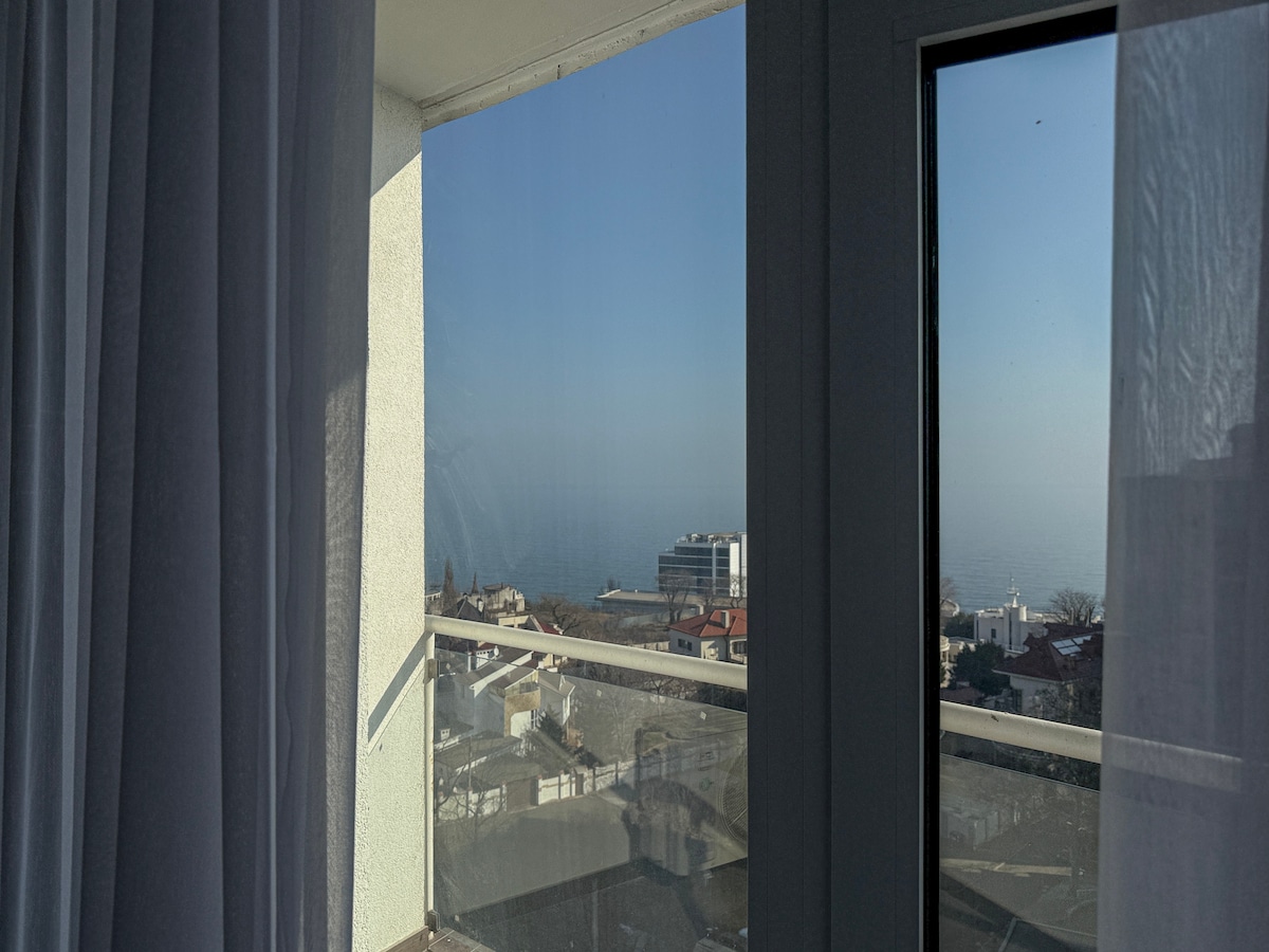Нова квартира з видом на море та 3 хвилин від піщаного пляжу! Дві окремі кімнати і двома балконами з видом на море: спальня з ліжком , кухня-студія з розкладним диваном. Закрита теріторя. Є кав'ярня та дитячий майданчик. У пішій доступності продуктові магазини та ресторани. У квартирі є все для комфортного проживання: Пральна машина, Wi-Fi, Кавомашина , Постільна білизна та ванні приналежності ✔ Також надається Паркомісце (за додаткову плату)