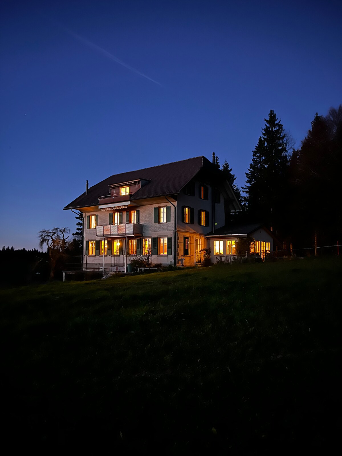 Затишна та стильно обставлена квартира знаходиться на 2-му поверсі нашої 100-річної колишньої школи. Будинок розташований на пагорбах Емменталю в передгір’ї Альп на висоті близько 1000 метрів над рівнем моря. Якщо ви шукаєте спокою, любите тварин і природу, ви в потрібному місці. Красивий ліс розташований просто за будинком, а з балкону відкривається фантастичний вид від Юри до Бернських Альп. Пішохідні стежки та велосипедні маршрути знаходяться прямо біля вашого порога.