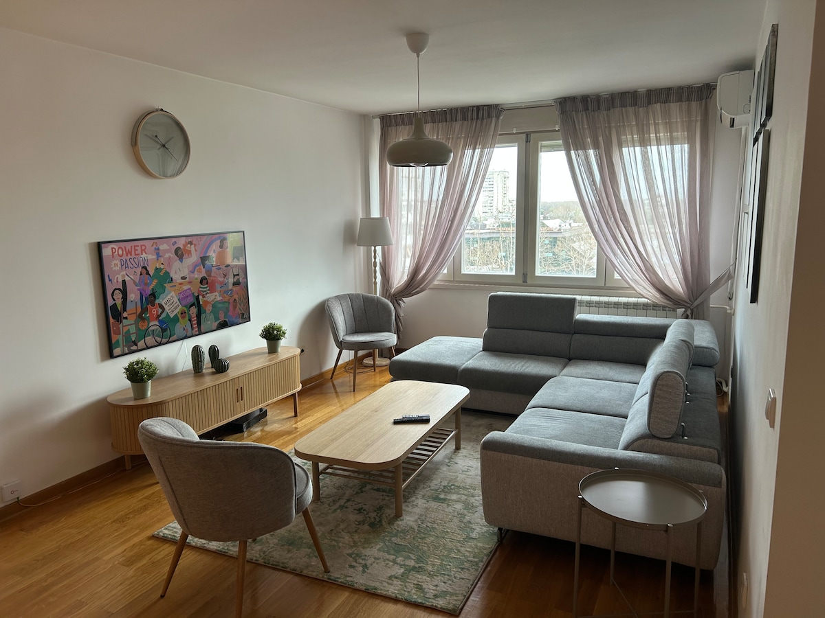 Яскрава та затишна квартира для чотирьох осіб у центрі Нового Белграда. Завдяки безкоштовній громадській парковці перед будівлею та чудовим сполученням з громадським транспортом, який зупиняється перед будівлею, включаючи прямий автобус до аеропорту, ця квартира ідеально підходить для вас. Квартира розташована на 3-му поверсі і має окрему спальню та додаткове ліжко у вітальні, яке розкладається в двоспальне ліжко. Вона має кухню та ванну кімнату з усім необхідним.