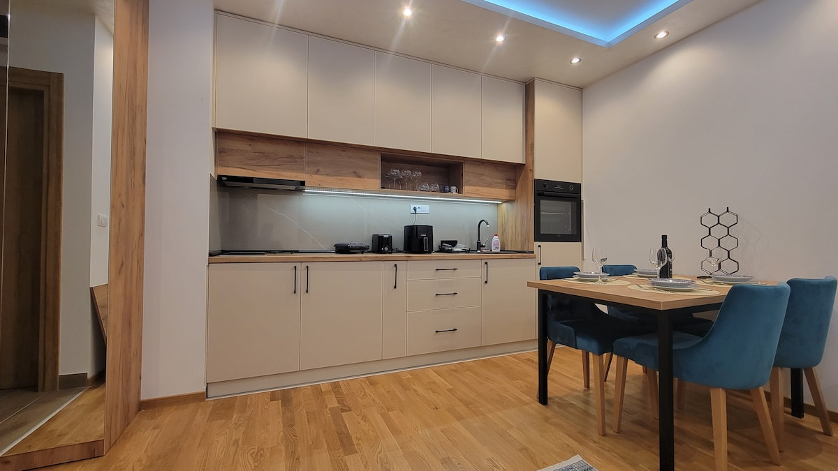 Розкішна квартира в центрі Златибора з паркінгом у підземному гаражі та Спа-центрі всього в кількох кроках. З видом на гондолу і пагорб з тераси з гойдалкою ця квартира стає особливою. Ліжко королівського розміру - це ще один елемент, який ми підготували для більшої сім 'ї. Не тільки для сім' ї, ми дружні до дитини квартира з ліжечком і стільцем для годування.