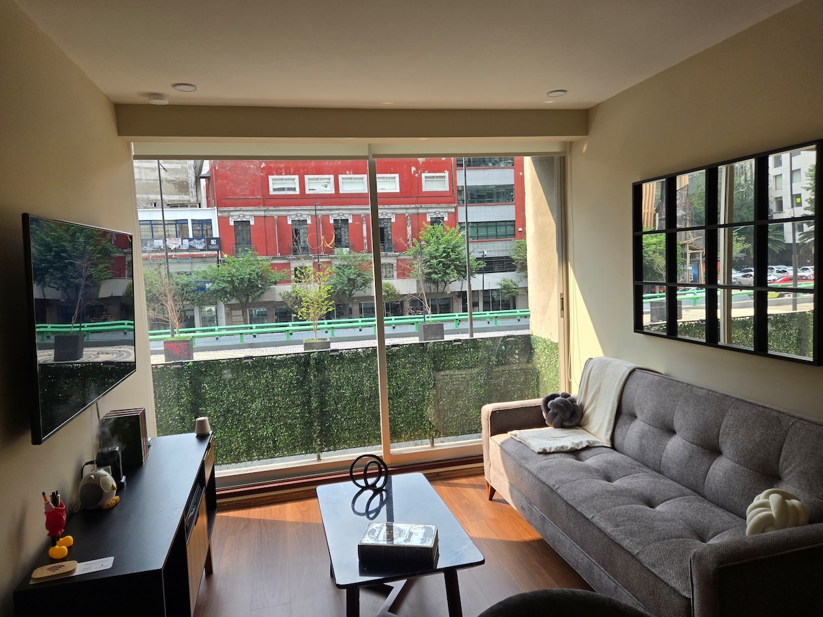 Ця квартира розташована в колонії Куаутемок на вулиці Ріо Рін 59 і є ідеальним місцем для вивчення міста. У декількох хвилинах ходьби від культового проспекту Реформа та Ангела Незалежності ви опинитеся в центрі подій. – Високошвидкісний Wi-Fi: щоб ви завжди були на зв’язку. - Паркування: доступне в будівлі, тому ви можете легко приїжджати та виїжджати. - Будинок із відеоспостереженням та цілодобовим спостереженням, тренажерним залом, багатофункціональною кімнатою та загальним садом на даху.
