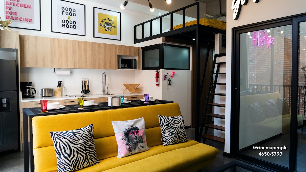 Творчий та унікальний лофт у районі Гватемала-Сіті 4! - Творче та барвисте оформлення - Повністю обладнана кухня. - Led Luces and Photography Areas - Розумний телевізор у вітальні та спальні. - Теплі природне та штучне освітлення - Робочий простір для віддаленої роботи - Дзеркало повної довжини - Повнорозмірне ліжко - вогнегасник і детектори; - Мінібар з напоями на продаж - Кав 'ярня - Необмежена кількість фільтрованої води - Настільні ігри у неділю - Едіфіліо з багатьма зручностями.