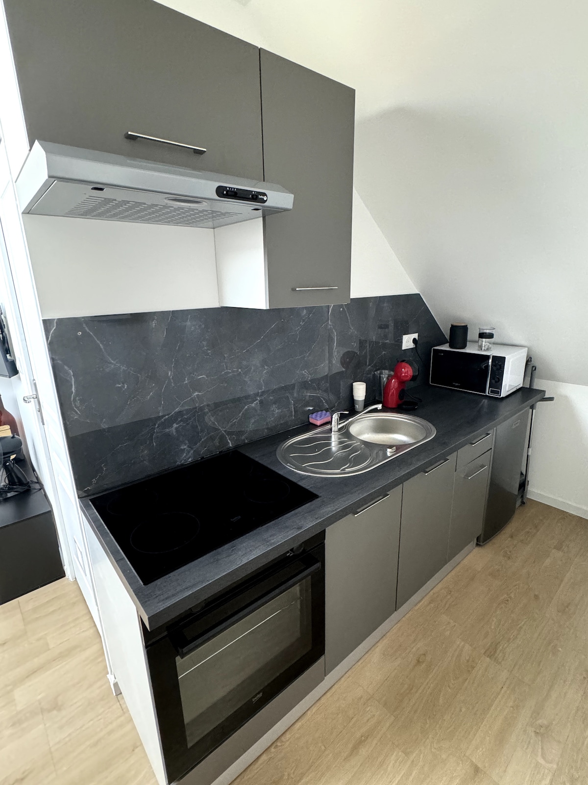 Студія включає одну спальню, невелику їдальню, раковину, ванну кімнату та туалет. Спальня площею 13 м2 , розташована на першому поверсі, окремий вхід через коридор з видом на вулицю. Холодильник, мікрохвильова піч, електрична варильна поверхня, стіл, стіл, столові прибори, кавоварка, чайник, прасувальна дошка та праска, фен... 500 м від Притане. 700 м від автовокзалу. 4,5 км від зоопарку Ла-Флеш. Прибуття можливе в повній автономі за допомогою «сейфа». Безпечне розташування велосипеда.
